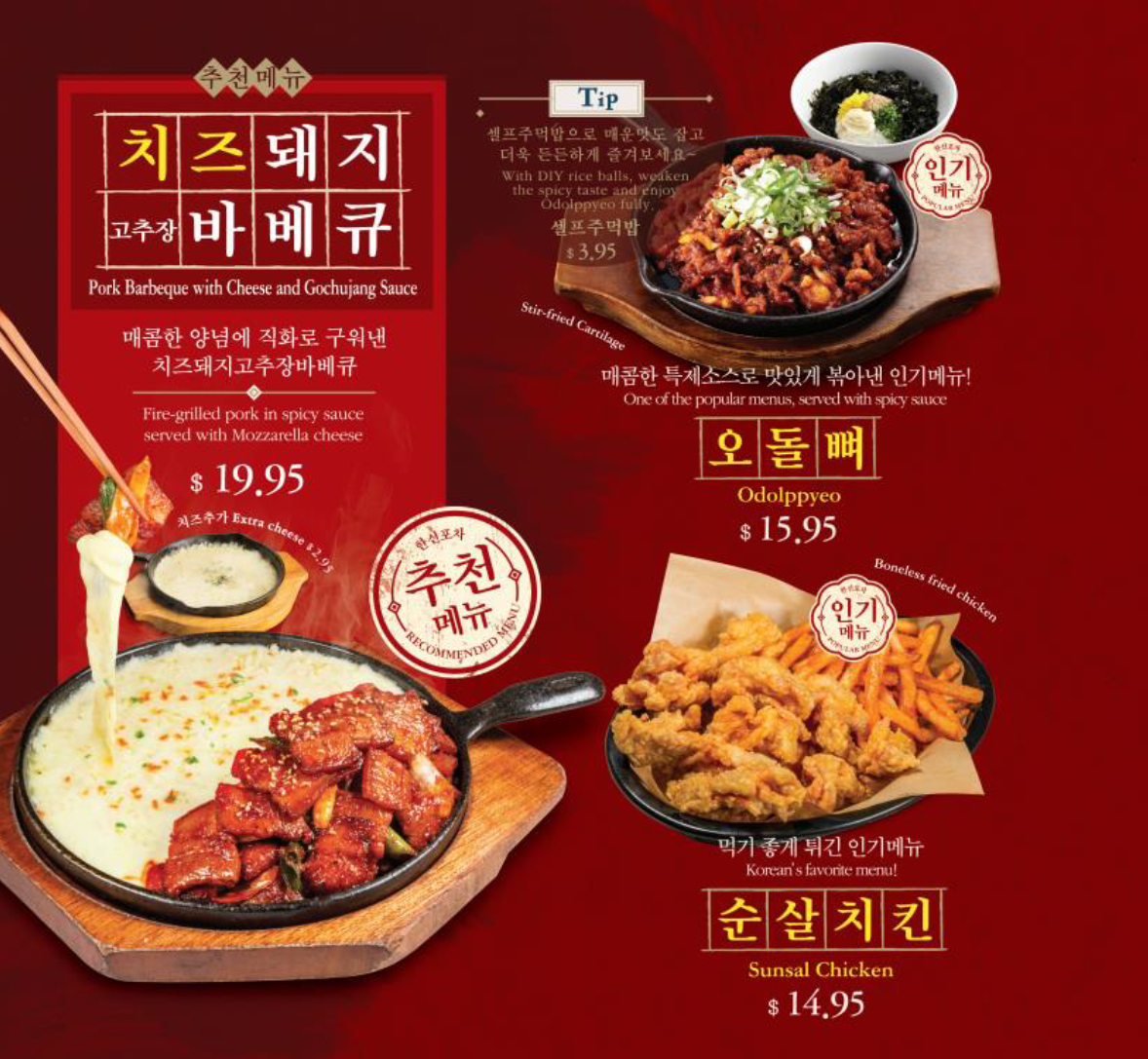 매콤한 양념에 직화로 구워낸 치즈돼지고추장바베큐 / fire-grilled pork in spicy served with mozzarella cheese